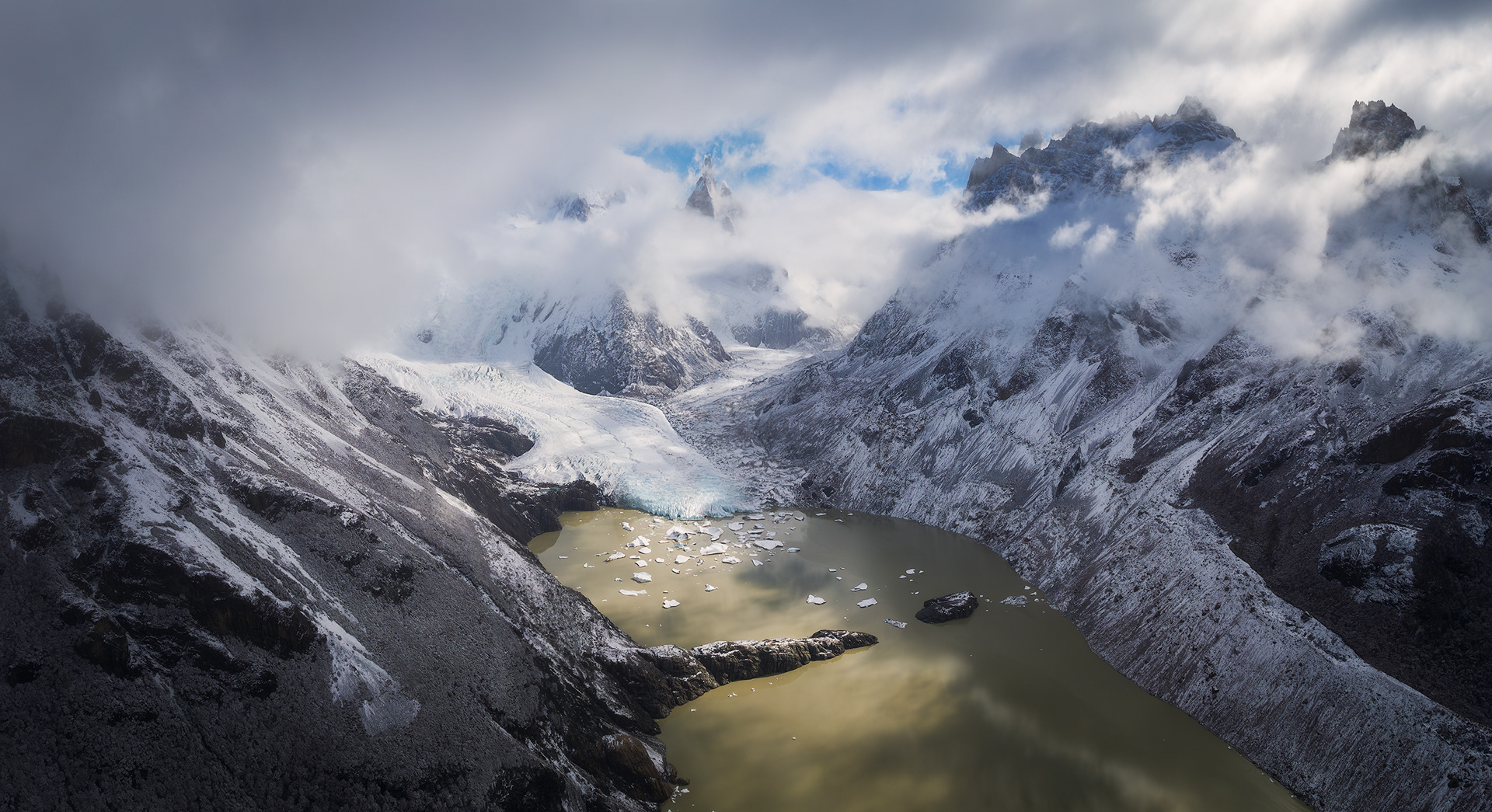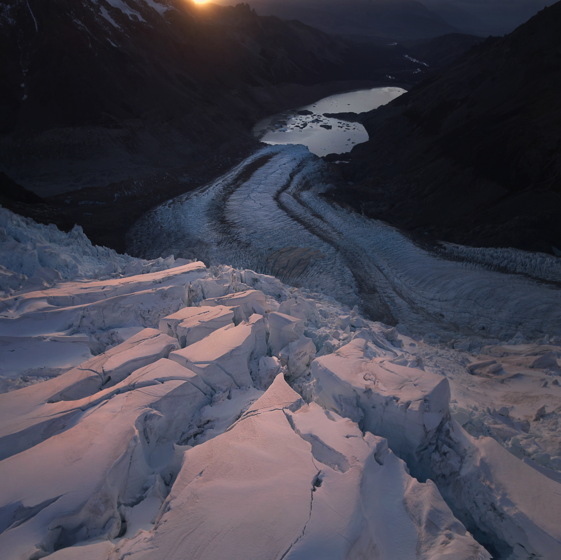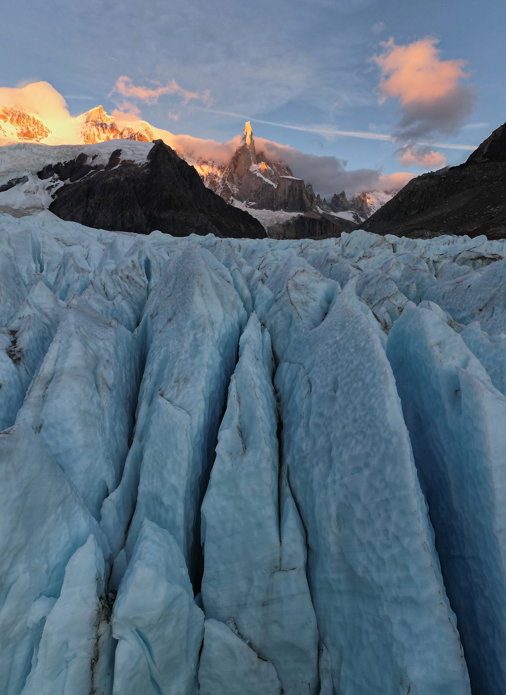 I walked back a short way down the Torre Glacier the next morning to shoot a magical sunrise. After exploring some other interesting glacial features including an icy portal to hell, I headed back to Niponino and went to sleep for a few hours. The light was incredible that evening for a drone flight.
