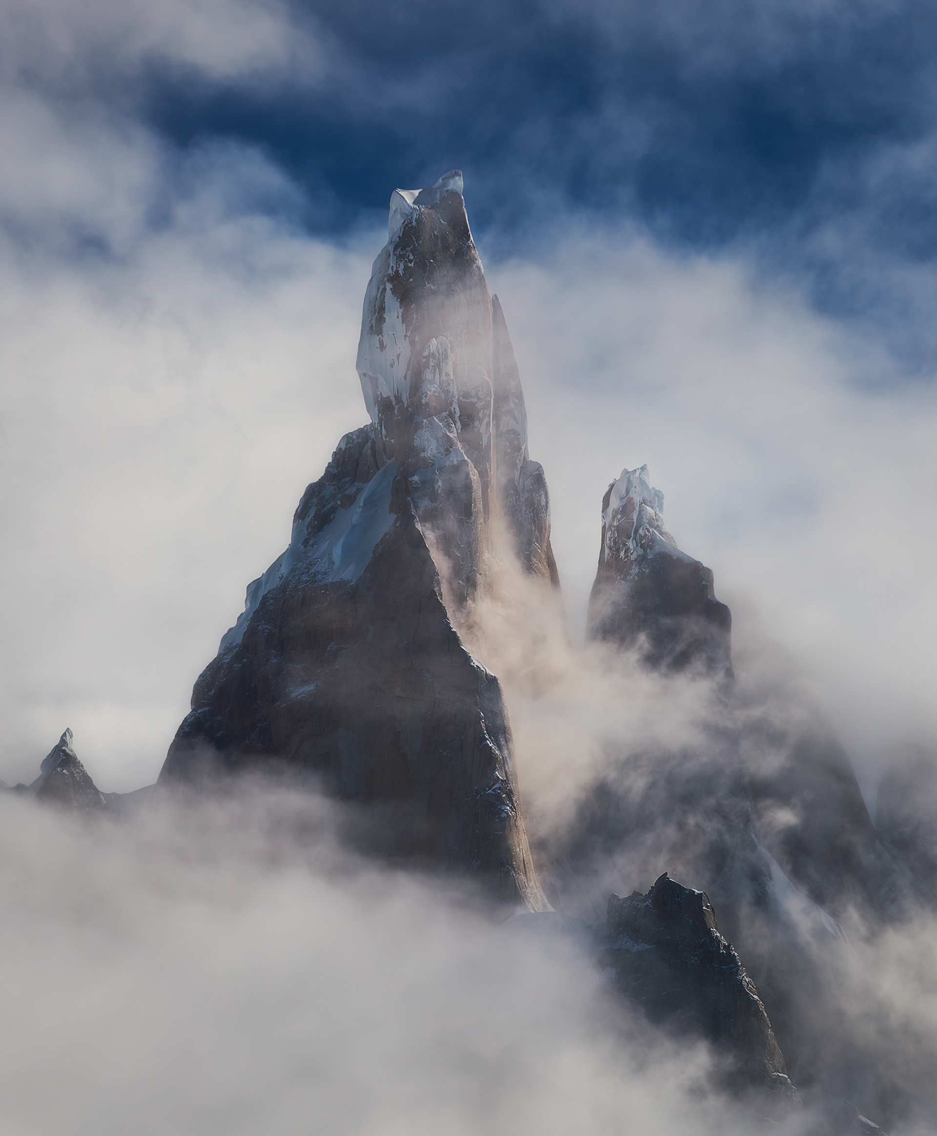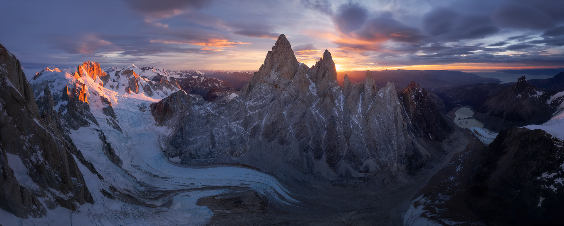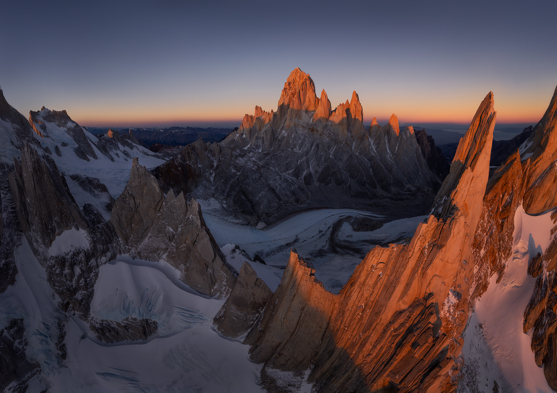Another weather window arrived two days after Fiona flew home, and I headed back into the Torre Valley with the sense that there was still a lot more to see and photograph out there. This time I started hiking from town at around 6pm for no good reason and walked for 11 hours through the night, arriving at Noruegos at the base of Cerro Torre at around 5am. Though it was a rather silly endeavor, it was invigorating to push myself and give myself a reminder that I’m still quite capable of doing hard stuff in the mountains when I want to despite feeling less of a drive to do so compared to a couple years ago. It was also cool to do this with relative ease in the dark in a single push when the exact same route had felt like a huge adventure just three weeks earlier. I reveled in walking across the glacier at night, in complete silence except for the crunch of my crampons digging into the glittering ice, with the watchful forms of Cerro Torre and Fitz Roy silhouetted against the starry sky. Upon arriving to Noruegos exhausted, I found a bivy cave and slept for a couple hours before waking up to shoot sunrise. There was a cloud inversion over the icefield with some of those clouds pluming over the summits of Torre, Egger, and Stanhardt. I kept trying to fly the drone up close to the summit mushroom of Egger but the wind up there was ripping too powerfully for the drone to handle, and I just barely managed to land it before the battery died in the wind and cold. I slept most of the rest of the day and then flew the drone around Aguja Bifida at sunset, nearly losing signal behind the rock tower.