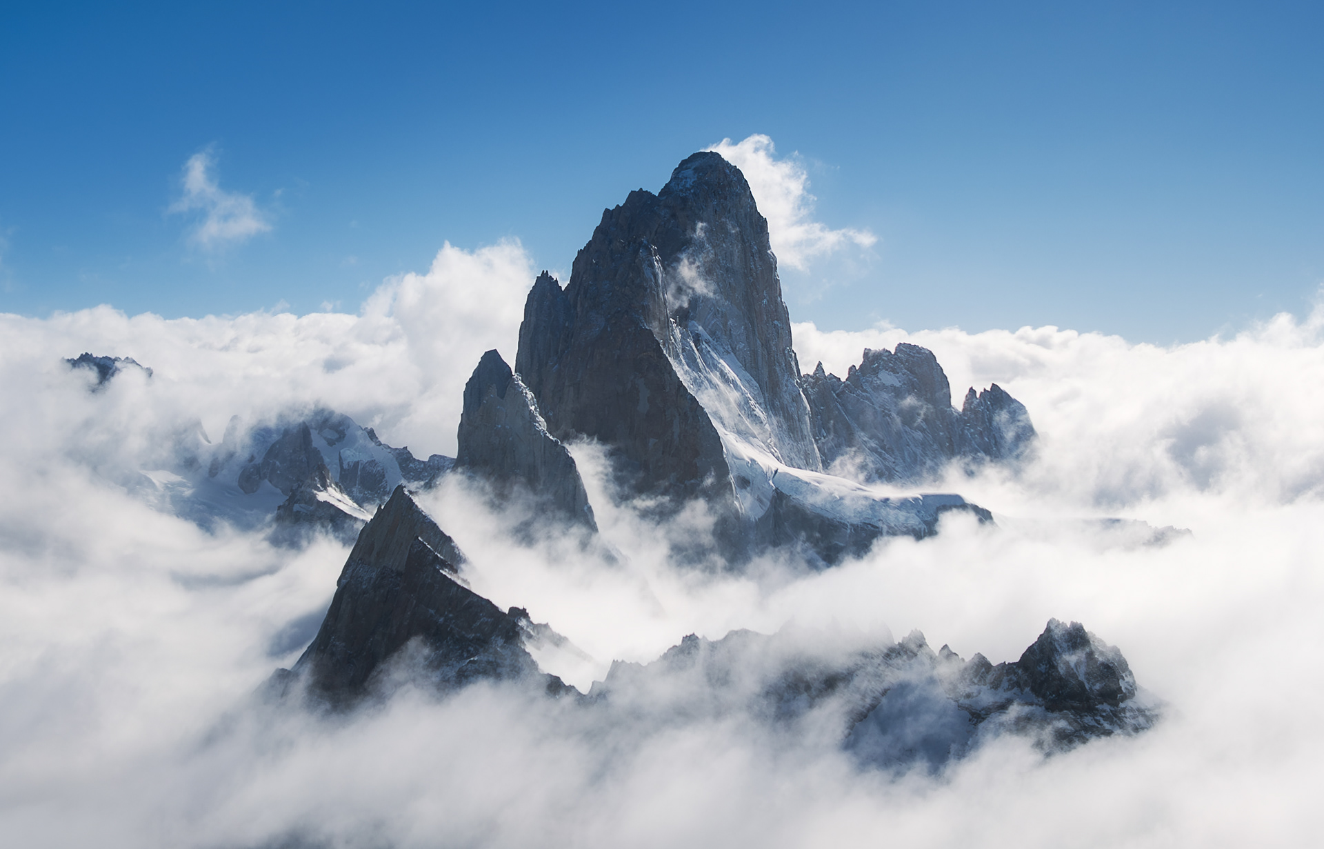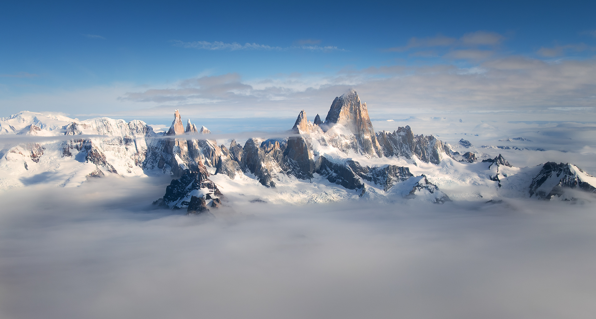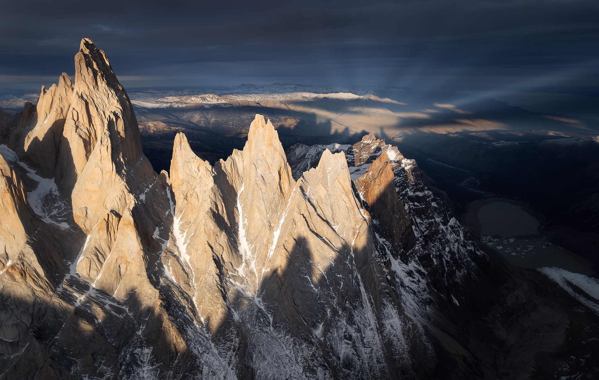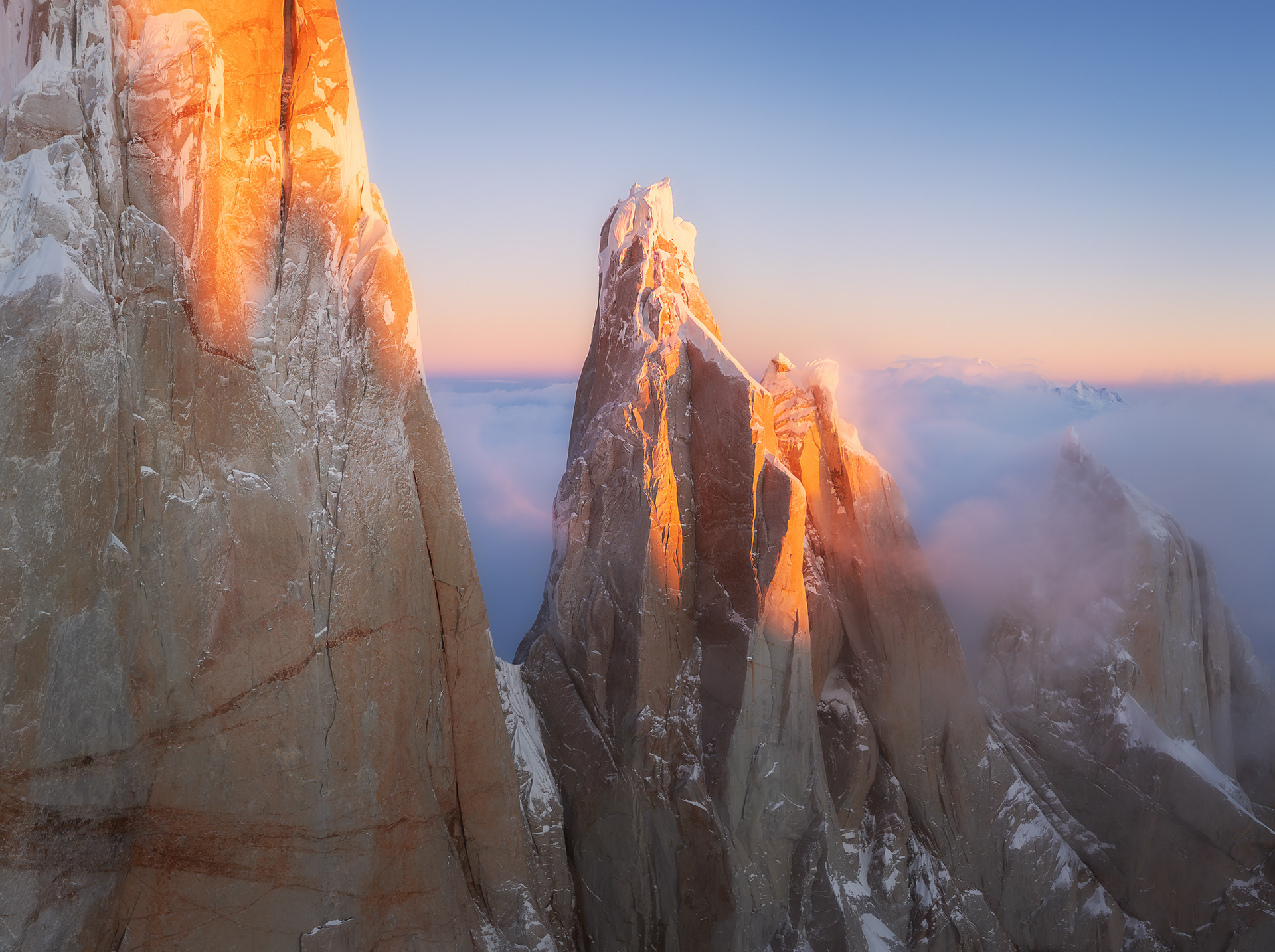 Another weather window arrived two days after Fiona flew home, and I headed back into the Torre Valley with the sense that there was still a lot more to see and photograph out there. This time I started hiking from town at around 6pm for no good reason and walked for 11 hours through the night, arriving at Noruegos at the base of Cerro Torre at around 5am. Though it was a rather silly endeavor, it was invigorating to push myself and give myself a reminder that I’m still quite capable of doing hard stuff in the mountains when I want to despite feeling less of a drive to do so compared to a couple years ago. It was also cool to do this with relative ease in the dark in a single push when the exact same route had felt like a huge adventure just three weeks earlier. I reveled in walking across the glacier at night, in complete silence except for the crunch of my crampons digging into the glittering ice, with the watchful forms of Cerro Torre and Fitz Roy silhouetted against the starry sky. Upon arriving to Noruegos exhausted, I found a bivy cave and slept for a couple hours before waking up to shoot sunrise. There was a cloud inversion over the icefield with some of those clouds pluming over the summits of Torre, Egger, and Stanhardt. I kept trying to fly the drone up close to the summit mushroom of Egger but the wind up there was ripping too powerfully for the drone to handle, and I just barely managed to land it before the battery died in the wind and cold. I slept most of the rest of the day and then flew the drone around Aguja Bifida at sunset, nearly losing signal behind the rock tower.