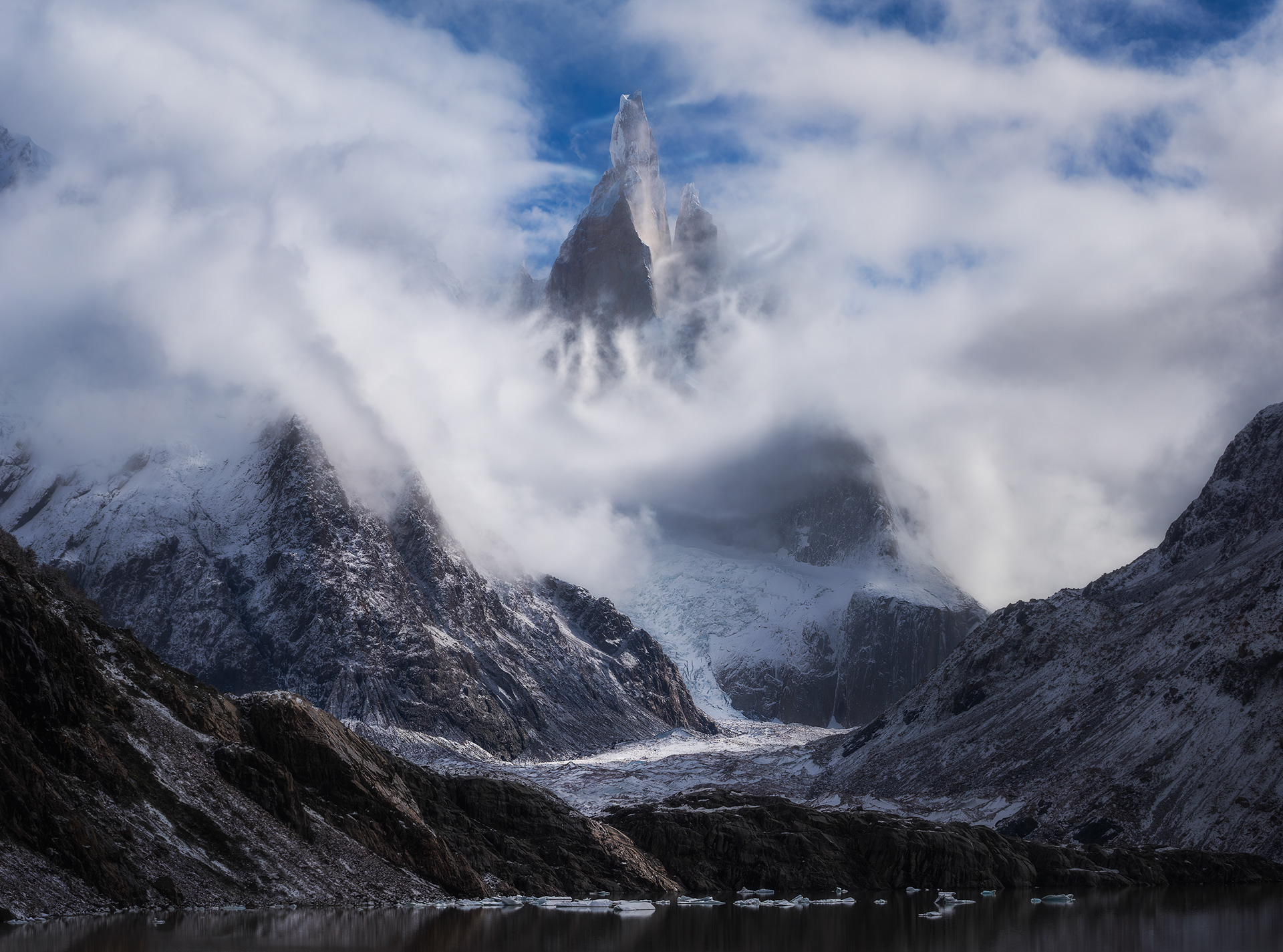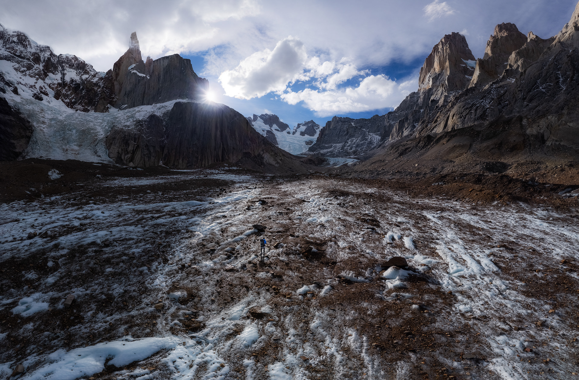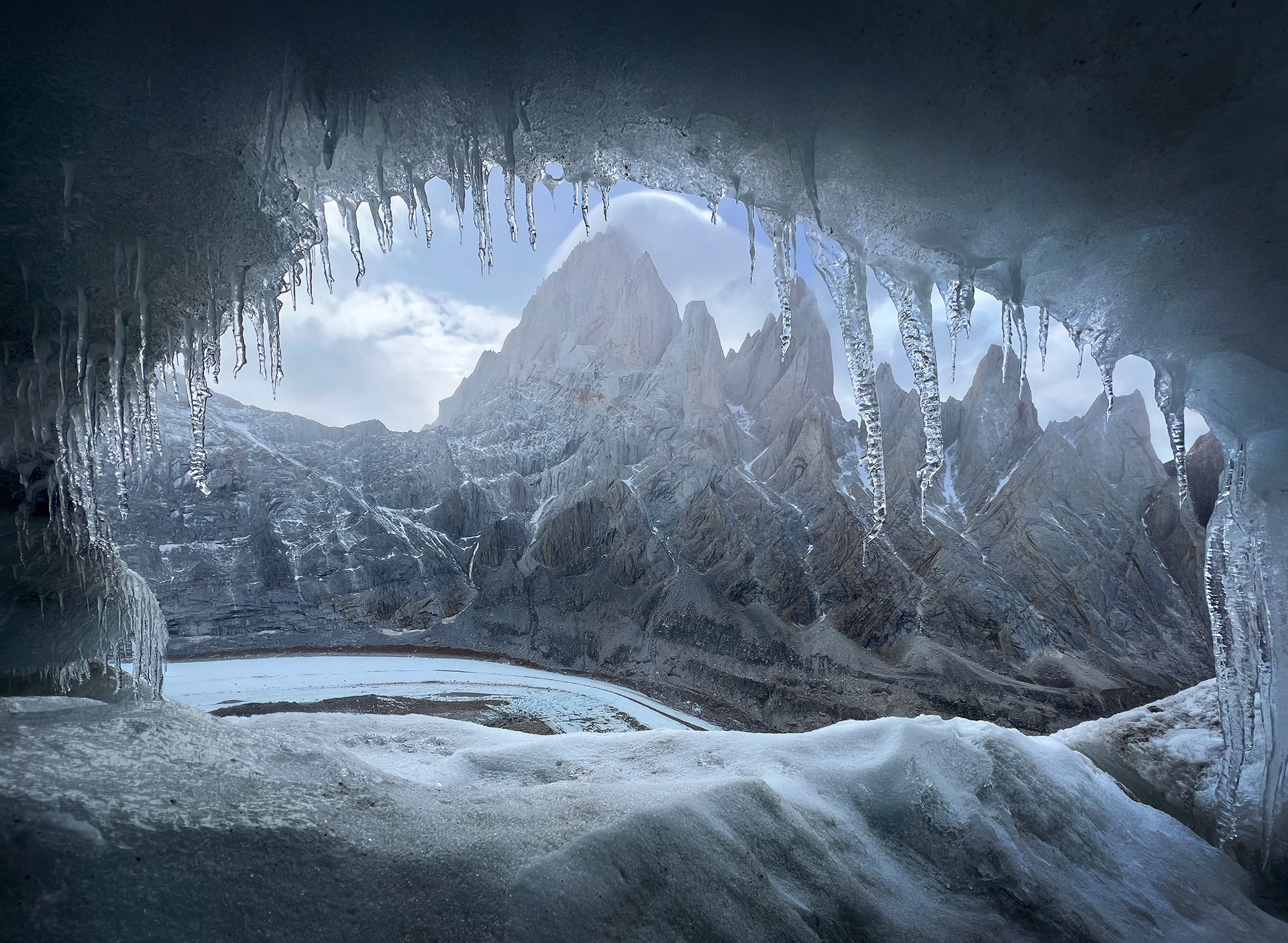 Sunrise was spectacular the next morning, still with plenty of wind for the drone to battle. I spent the next few hours scrambling around on the slabs above Noruegos, about as close to the base of Cerro Torre as I could get without entering sketchy glaciated terrain. There were many incredible ice caves up there framing the west face of Fitz Roy with interesting light and weather blowing through all day. The weather started worsening and I went back down to my bivy cave to take a late afternoon nap. It was only getting stormier when I awoke from my nap and the forecast looked terrible for the following few days so I decided it was probably a good time to bail. I packed up and started descending the steep and loose terrain down to the glacier. The unrelenting wind seemed to get funneled through the glacial corridor between Cerro Torre and Fitz Roy. I was getting violently blown forward while being pelted with freezing rain. I was glad to get a little taste of the true fury of this place. It felt as though the mountains were telling me in no uncertain terms that I’d spent enough time here and it was time to leave, literally blowing me out of the valley. I set up camp for the night once I got across the glacier, used my last drone battery the next morning, and walked back to town.
