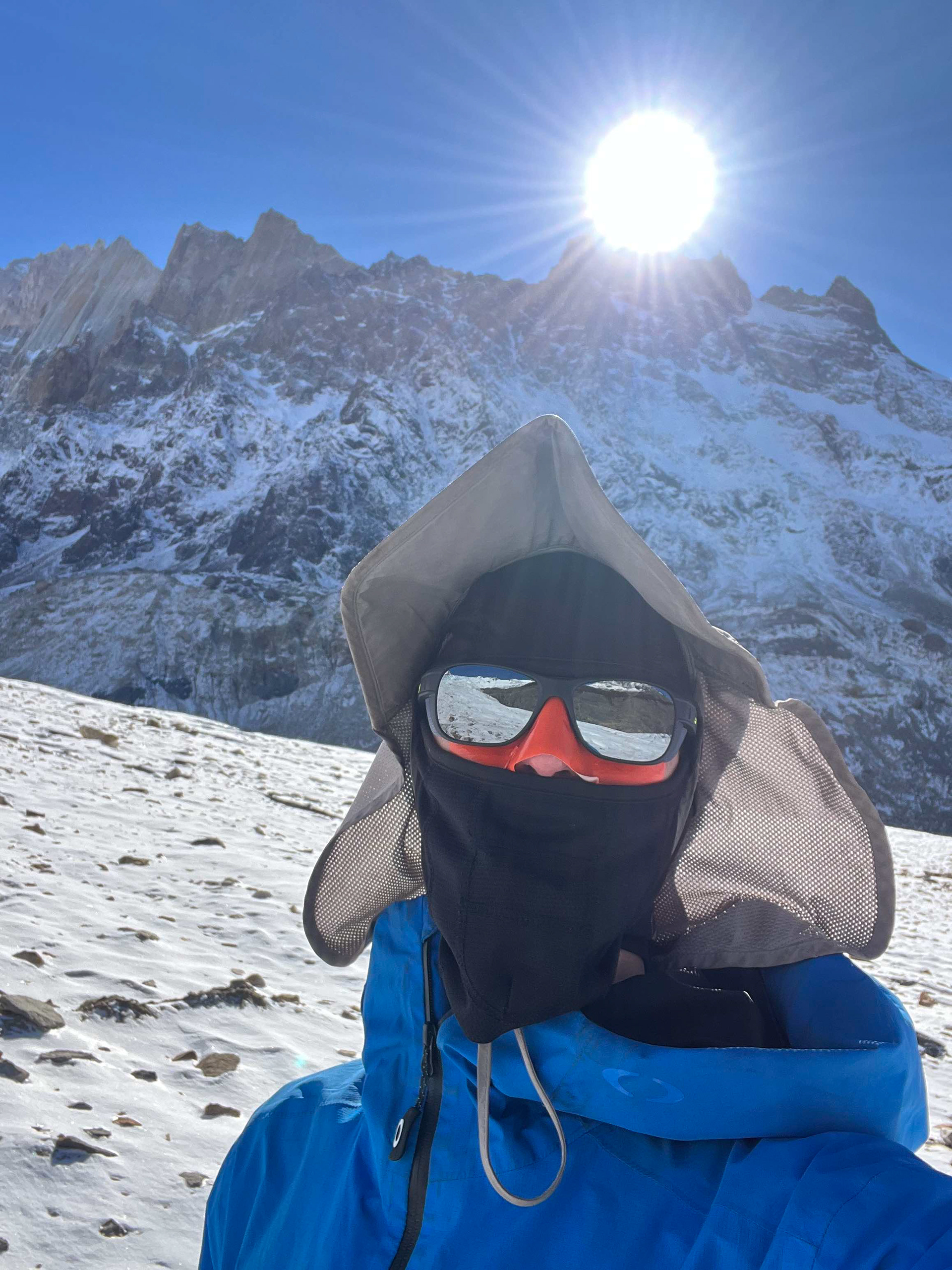 I hiked out to Laguna Torre in the evening on April 1st, woke up for an underwhelming sunrise, and then went back to sleep in my bivy sack. It started dumping snow during my nap and I was awoken by Manu, a concerned park ranger wondering if I was ok lying in the fetal position on the ground with snow piling up on top of me. I assured him that everything was great and this was just how I tend to operate, but he still seemed concerned. He invited me into their cook tent for pancakes and warm drinks before I headed on my way. I made very slow progress the next day, taking hours to walk just a couple miles in total. Intermittent snow flurries made for remarkable conditions and I couldn’t stop taking photos of the ice queen Cerro Torre in all her glory. I slept at the edge of the glacier that night so I could start early the next day and navigate the glacier with plenty of daylight.